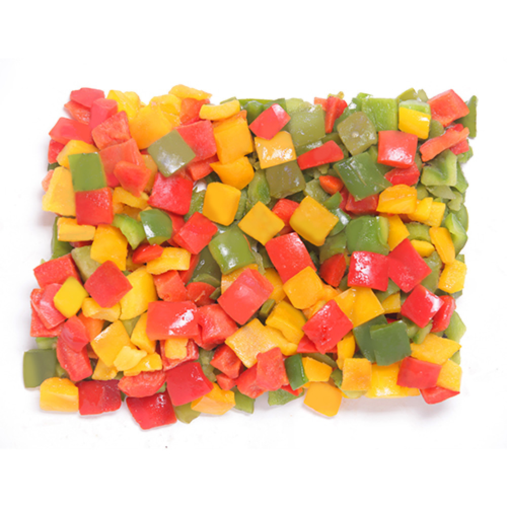 Frozen red, green and yellow bell peppers, in their processes blanched and roasted in strips and dices presentations.