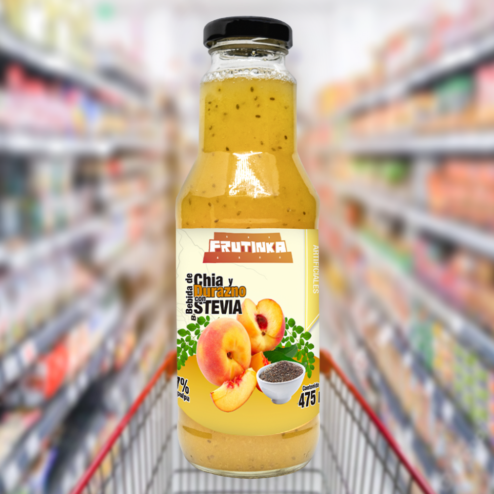 BEBIDA DE DURAZNO CON 17% DE PULPA Y CHÍA, ENDULZADO PARCIALMENTE CON STEVIA SIN COLORANTES NI SABORIZANTES ARTIFICIALES. LIBRE DE OCTÓGONOS DE ADVERTENCIA, BAJOS EN AZÚCAR Y EN SODIO. ESTAMOS BAJO LA LEY N° 30021, LEY DE PROMOCIÓN DE LA ALIMENTACIÓN SALUDABLE PARA NIÑOS, NIÑAS Y ADOLESCENTES.
