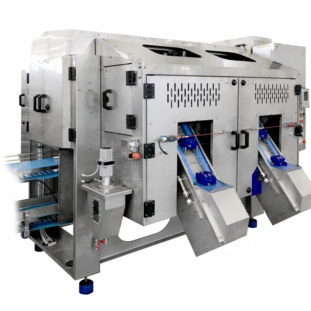 DESPEDADORA AUTOMÁTICA DE MANGOS, CON ALIMENTACIÓN MANUAL DE FRUTAS Y TRASLADO DIRECTO A LAS ESTACIONES DE CORTE INFERIOR Y SUPERIOR, SEGÚN UNA SECUENCIA DE OPERACIONES PROGRAMADA.